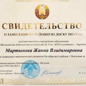 Поздравляем коллектив государственного учреждения образования «Могилевская детская школа искусств № 3 им. М.Н.Солдатова» с занесением на доску Почета Октябрьского района г. Могилева победителей соревнования за 2025 год среди учреждений культуры!