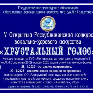 Без рубрики ДОРОГИЕ ДРУЗЬЯ! ПРИГЛАШАЕМ К УЧАСТИЮ! ГУО «Могилевская детская школа искусств №3 им. М.Н.Солдатова» приглашает принять участие в V Открытом Республиканском конкурсе вокально-хорового искусства «ХРУСТАЛЬНЫЙ ГОЛОС» (г.Могилев,РБ). / 20.10.2025 читать далее