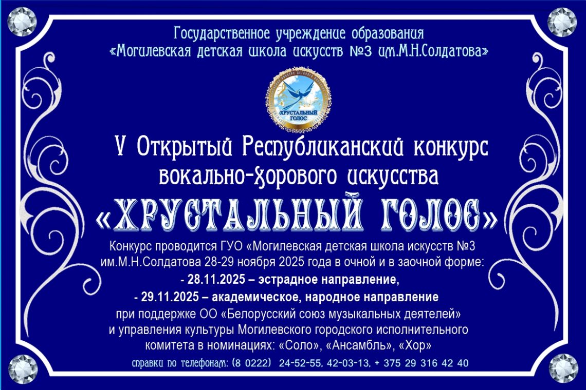 ДОРОГИЕ ДРУЗЬЯ! ПРИГЛАШАЕМ К УЧАСТИЮ! ГУО «Могилевская детская школа искусств №3 им. М.Н.Солдатова» приглашает принять участие в V Открытом Республиканском конкурсе вокально-хорового искусства «ХРУСТАЛЬНЫЙ ГОЛОС» (г.Могилев,РБ).