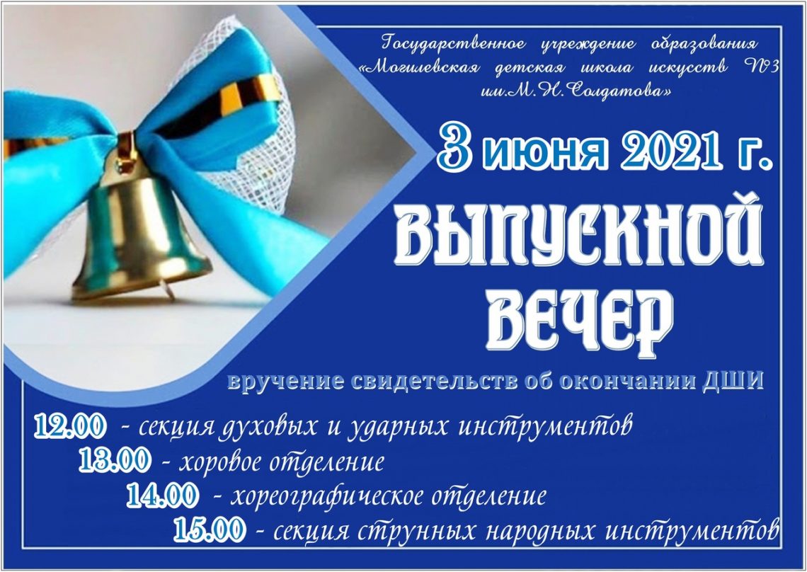 Приглашаем вас 3 июня 2021 г. на Торжественное вручение свидетельств об окончании Могилевской детской школы искусств №3 им.М.Н.Солдатова”. 01.06.2021 / 12.00 – секция духовых и ударных инструментов; 13.00 – хоровое отделение; 14.00 – хореографическое отделение; 15.00 – секция струнных народных инструментов