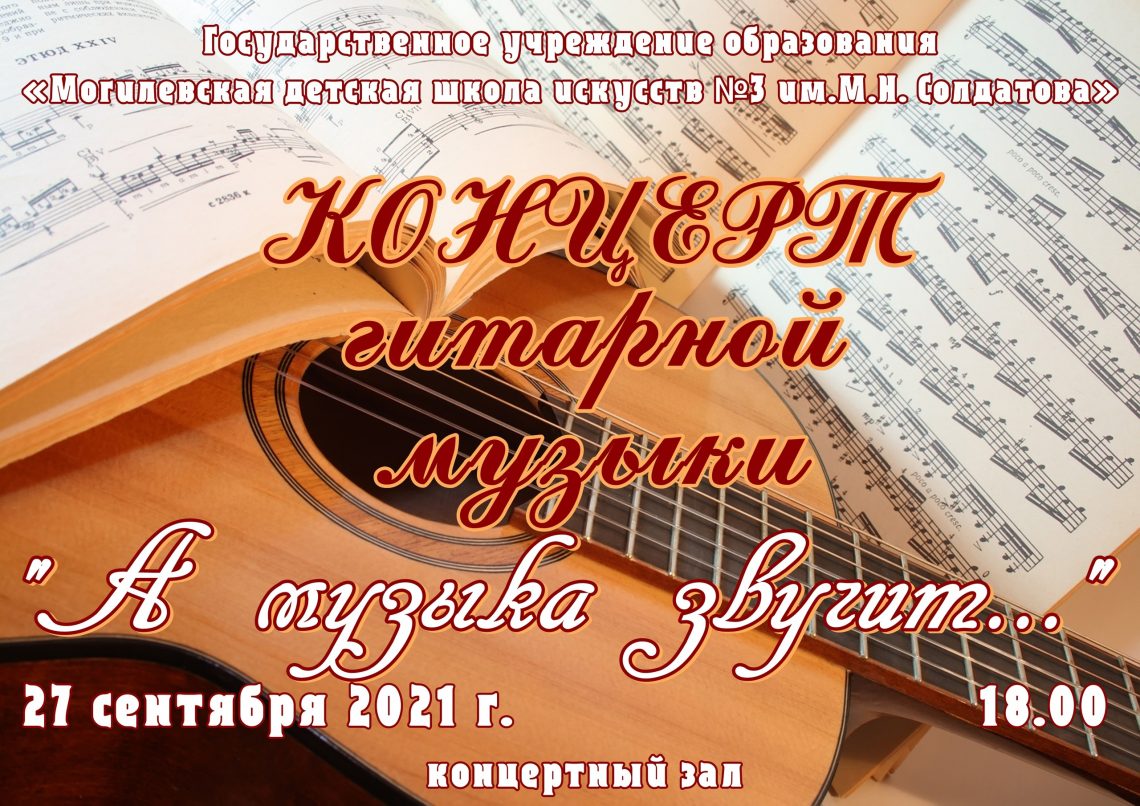 27 сентября (понедельник) 2021 года в 18.00 в концертном зале ГУО “Могилевская детская школа искусств №3 им.М.Н.Солдатова” (пр. Шмидта, 19) состоится концерт гитарной музыки “А музыка звучит…”.